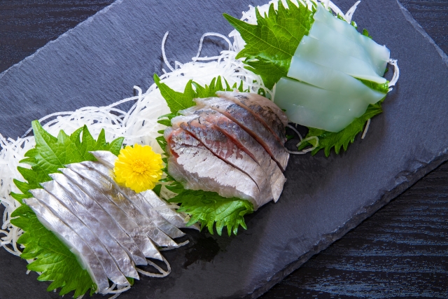 シソの名前の由来は「(命を)蘇らせる」。その強い殺菌成分「ペリルアルデヒド」は、食中毒を防ぐ「天然のガードマン」です。横にある「ツマ(大根)」も消化を助ける役割があり、どちらも「一緒に食べて、お腹を守ってください」という先人の知恵なのです。